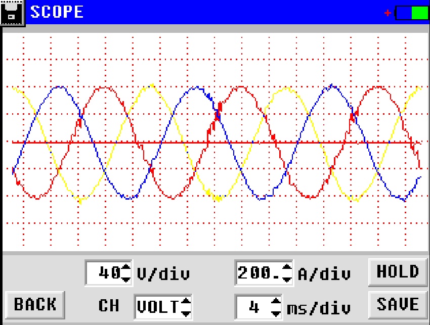 напряжения на каждой из 3-х фаз. В этом режиме отображаются среднеквадратические и пиковые значения указанных параметров. Возможа также запись гистограммы и временной диаграммы.