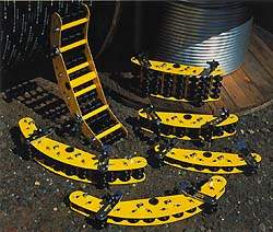 Существующие варианты таких систем, — а их насчитывается несколько десятков, — отличаются назначением, конструкцией и способом крепления (установка на край, в распор или на растяжках). Выбор делается в зависимости от расположения барабана лебедки (катушки), горловины и канала, а также типа кабеля (оптическое волокно нетерпимо к малым радиусам изгиба). Пожалуй, наиболее удобен в эксплуатации квадрантный блок. Он представляет собой набор конструктивно объединенных роликов небольшого диаметра для изменения направления кабелей с большим минимальным радиусом изгиба. Причем, в отличие от барабанов, он крепится обычным способом и занимает мало места. В еще более стесненных условиях можно применять защитный рукав: он хорошо обеспечивает ограничение радиуса изгиба.