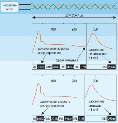 Как уже говорилось, рефлектометр определяет расстояние до неоднородности, исходя из скорости распространения сигнала в кабеле и времени его прохождения до неоднородности и обратно. В большинстве случаев скорость представляется в виде коэффициента, показывающего, насколько скорость распространения сигнала в данном кабеле отличается от скорости света; она берется из таблиц или определяется опытным путем. В импортных приборах чаще всего задается «коэффициент распространения» VOP (PVF). Обычно подобная характеристика выражается в виде доли от скорости света и может иметь значение от 0,30 до 1,00. Например, кабель со значением VOP = 0,66 позволяет передавать электрический сигнал со скоростью, равной 66% от скорости света. Иногда этот параметр кабеля выражается в виде фактической скорости и может иметь значение от 45 до 150 м/мс. В отечественных же приборах используется «коэффициент укорочения» g, являющийся безразмерной величиной (> 1).