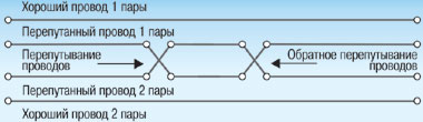 Простым решением для устранения переходных помех, возникающих из-за перепутанных пар, как уже упоминалось выше, является переход на исправную пару. Другой способ — исправление дефекта в следующей муфте кабеля. Речь идет о восстановлении правильности подключения (а фактически о повторном перепутывании тех же самых проводов). Это самые простые решения, которые конечно же не устраняют проблему. В любом случае данный участок кабеля должен быть отремонтирован.