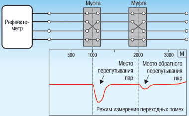 Искать места перепутывания проводов можно двумя способами. Простейшим является проверка кабеля с помощью рефлектометра на переходные помехи, когда обе перепутанные пары подключаются к портам рефлектометра: рефлектометр подает импульс в проверяемую пару кабеля, а по второй паре получает отраженный импульс. Обычно в точке перепутывания проводов на дисплее наблюдается заметный всплеск. Он может быть как положительной, так и отрицательной полярности, что зависит от полярности подключения тестовых выводов рефлектометра к проверяемым жилам кабеля.