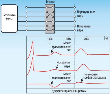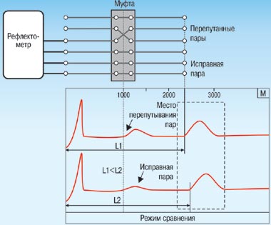 Другой способ — использование рефлектометра в дифференциальном режиме или режиме сравнения двух пар, когда пара с перепутанными проводами сравнивается с заведомо исправной парой или вычитается из нее (при дифференциальном режиме). Неисправная пара даст больший уровень отражения в той кабельной муфте, в которой и произошло перепутывание проводов. Именно здесь возникают наивысшие переходные помехи. (Сравнение или вычитание двух перепутанных пар кабеля не даст какой-либо индикации повреждения на дисплее прибора.) Кроме того, следует иметь в виду, что если на рефлектограмме виден разомкнутый дальний конец кабеля, то расстояние до него для перепутанной пары кабеля меньше, чем для «хорошей» пары кабеля из того же самого пучка. Перепутанный участок имеет более низкую емкость, а значит, сигнал перемещается по кабелю быстрее. Как следствие, рефлектометр интерпретирует этот участок кабеля как более короткий.