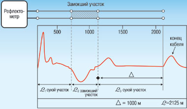 Из рисунка следует, что L2 = Lкабеля – (L1 + L3), где L2 — известная длина кабеля, а L1 и L3 — сухие участки.