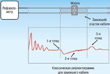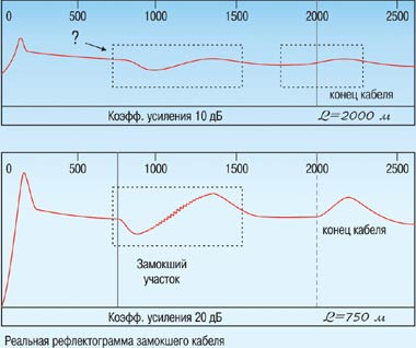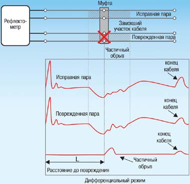 В качестве примера приведем процедуру поиска повреждений на участках замокшего кабеля с помощью рефлектометра. Кроме всего прочего, она позволяет убедиться в преимуществах дифференциального метода измерения в режиме реального времени.