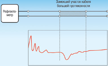 Вода в кабеле «замедляет» сигнал, причем на замокшем участке скорость распространения электрического сигнала меняется порой через каждый сантиметр. В результате значительно затрудняется измерение фактической длины всего кабеля и замокшего участка, так как рефлектометр измеряет промежутки времени. (Мостовой измеритель укажет, что длина кабеля больше, чем фактическая.) Вода значительно повышает емкость замокшего участка кабеля, поэтому подобрать нужное значение коэффициента распространения не удастся. Чтобы правильно определить длину кабеля, обычно измеряют длину сухого участка (с одной стороны или с обеих сторон). Если полная длина кабеля известна, из нее остается вычесть длины сухих участков. Очень часто граница замокшего участка начинается слишком близко от точки подключения рефлектометра. В таком случае прибор не выявит наличие воды. Поэтому кабель необходимо проверять с двух сторон.