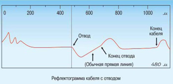 Подобно тому как эхосигналы воздействуют на передачу цифровых сигналов, параллельные отводы оказывают влияние на рефлектограмму кабеля. Интерпретация рефлектограммы значительно затрудняется, если к тестируемой паре подключены два и более параллельных отвода.