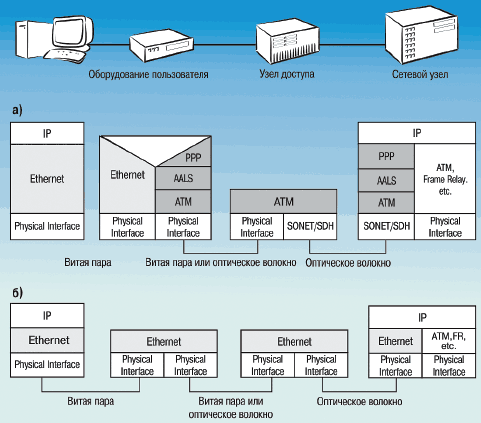Между помещением пользователя и узлом доступа в качестве протокола физического уровня на абонентских линиях из витой пары применяется протокол xDSL. По сути он служит только для доступа в Internet, по-этому функциональность и гибкость протокола АТМ, в частности приоритезация трафика реального времени, практически не востребованы, а его поддержка ведет лишь к излишней сложности (а). По этой же причине аппаратная реализация технологии ATM не дает выигрыша в отношении скорости передачи трафика по сравнению с программным решением маршрутизатора IP. Поэтому более естественным и простым подходом представляется замена АТМ на протокол Ethernet поверх xDSL (б), в результате чего удается исключить лишние подуровни, связанные с использованием АТМ.