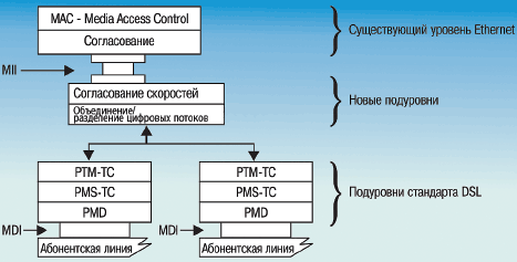 В новой технологии широкополосного доступа естественным образом учитываются условия ее работы. Так, в случае многопарного варианта технологии Е—SHDSL потребовалось введение дополнительных функциональных подуровней для согласования скорос-тей передачи и объединения/разделения стандартных цифровых потоков.